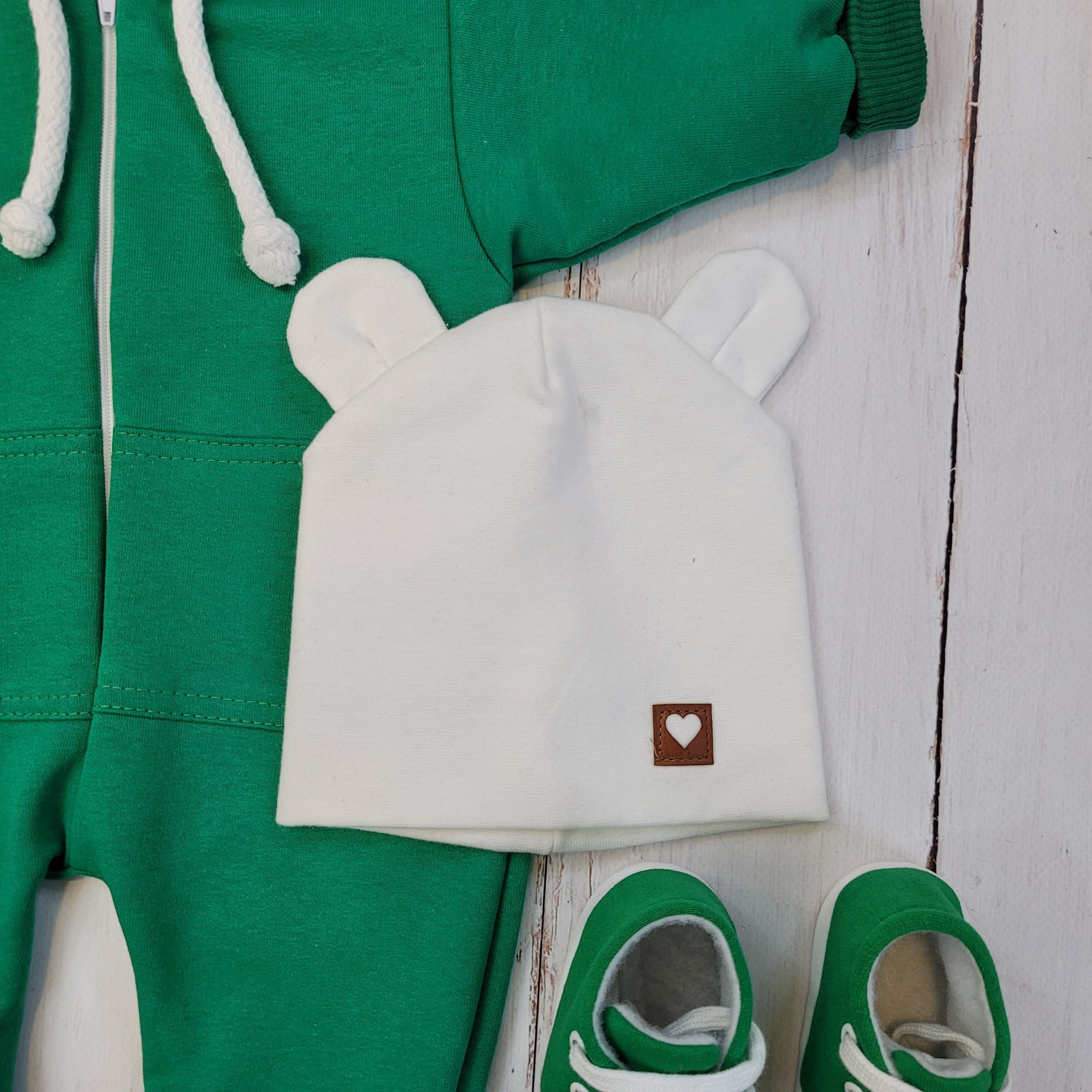 Kombinezon niemowlęcy dresowy jednowarstwowy + czapeczka podwójna z uszami + buciki dresowe