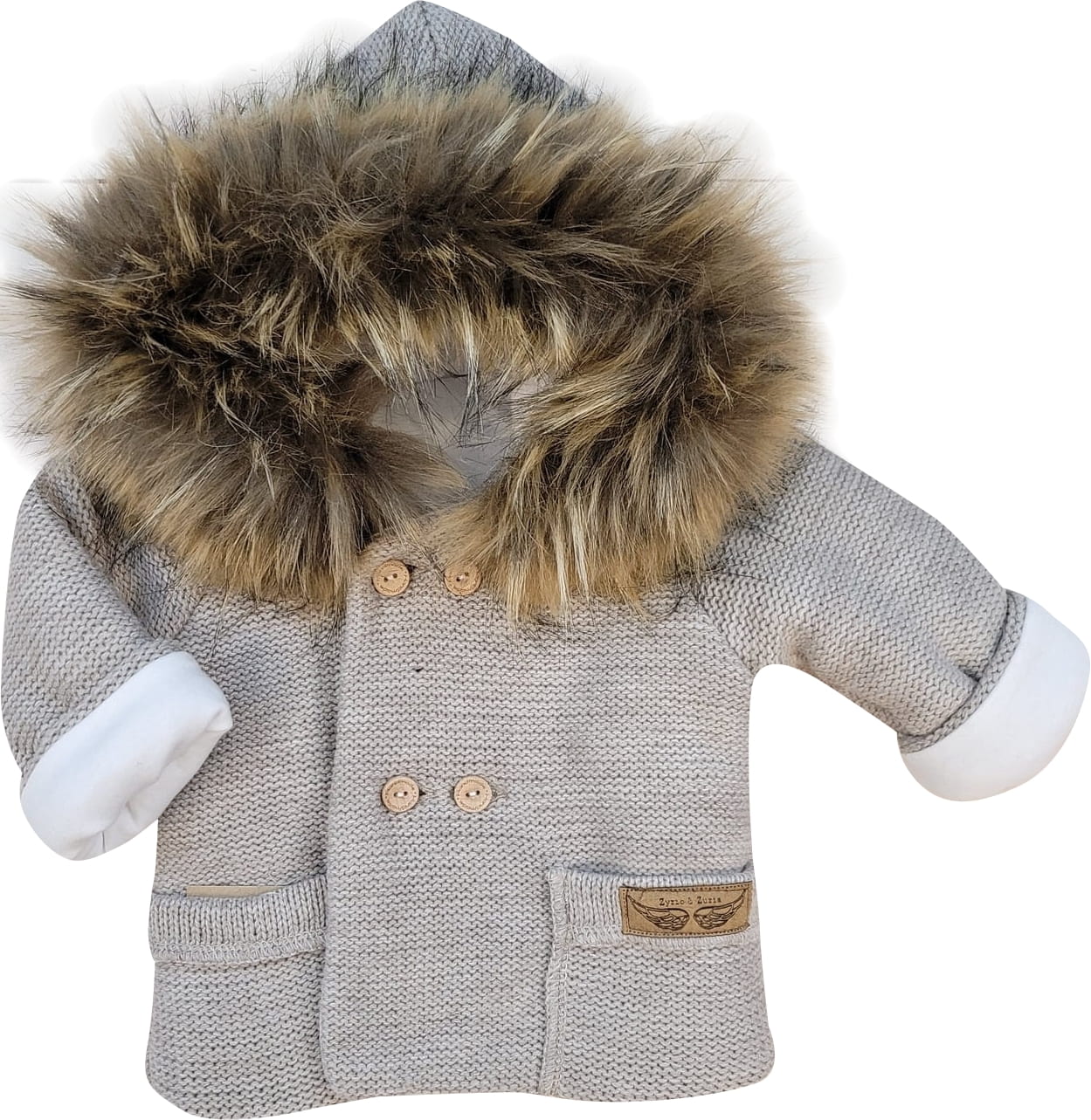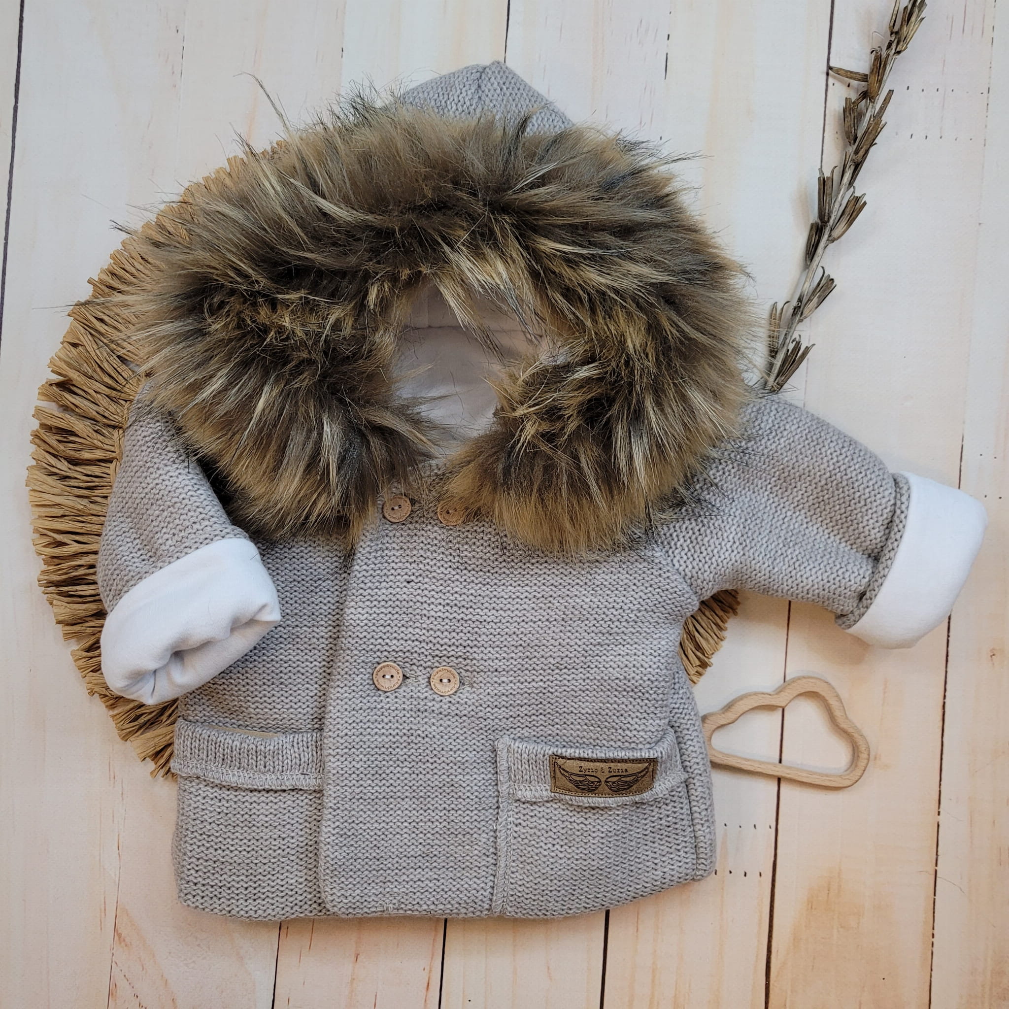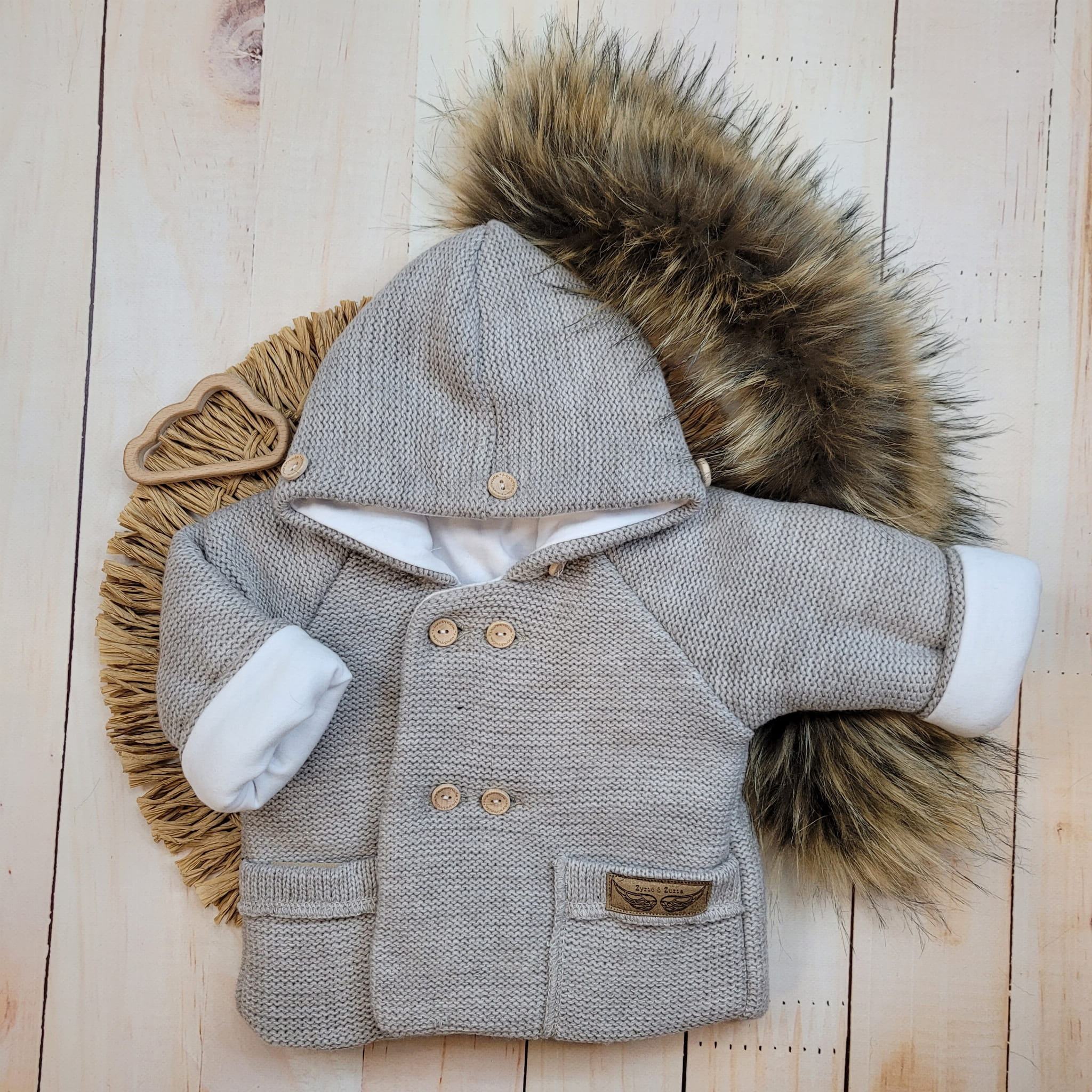 Przepiękna kurteczka niemowlęca, ocieplana, sweterkowa z kapturem. Posiada futerko na kapturze, które można odpiąć (dopinane na guziki)