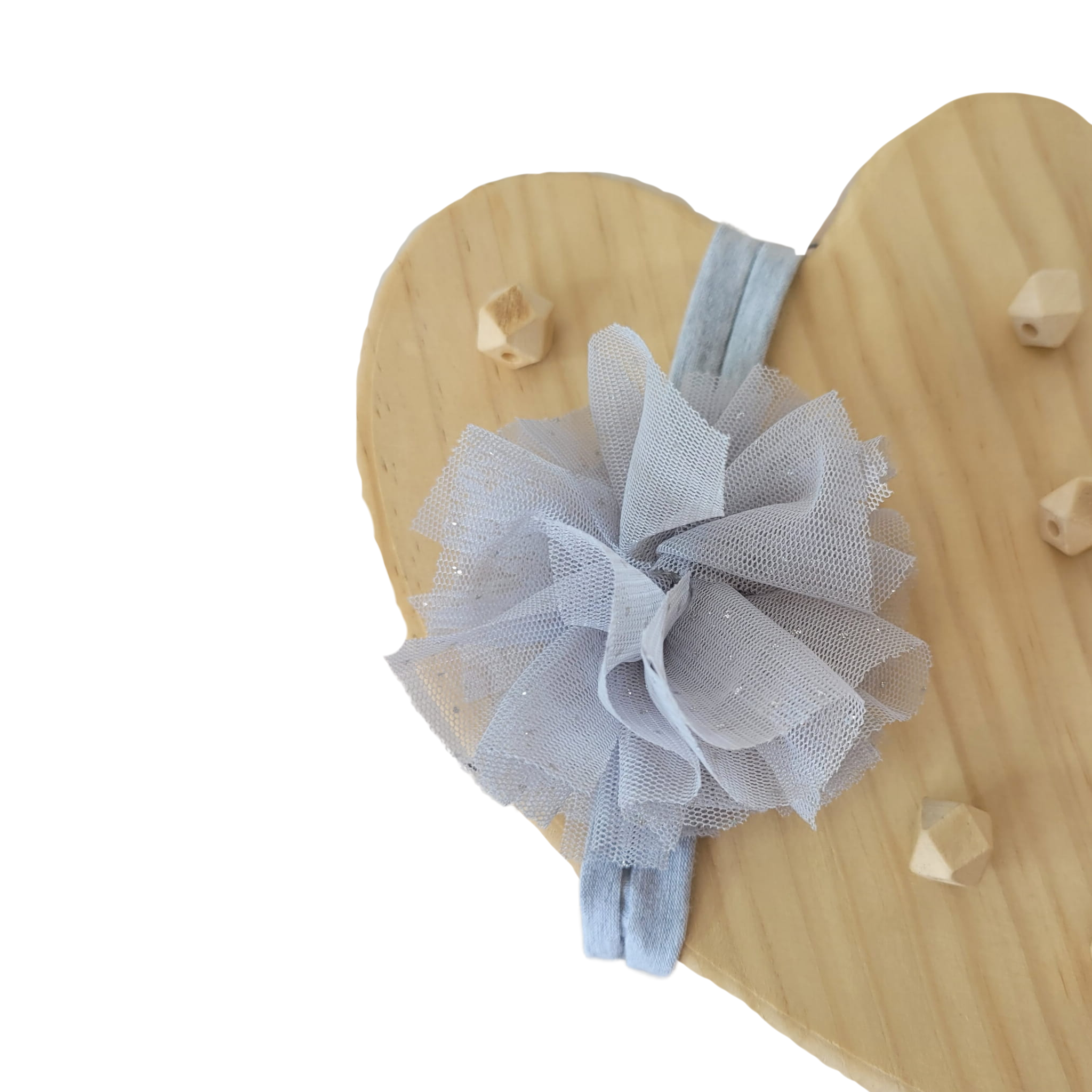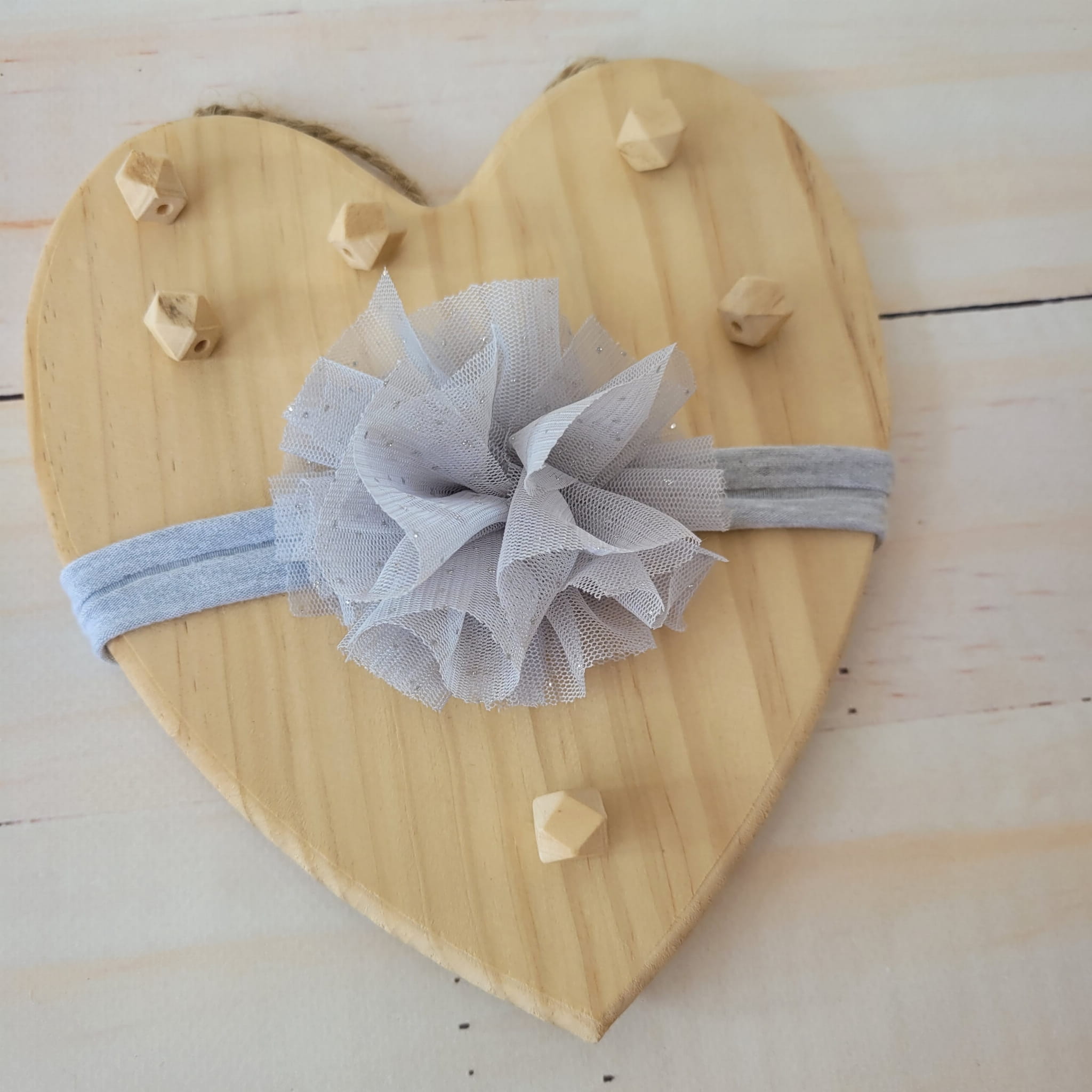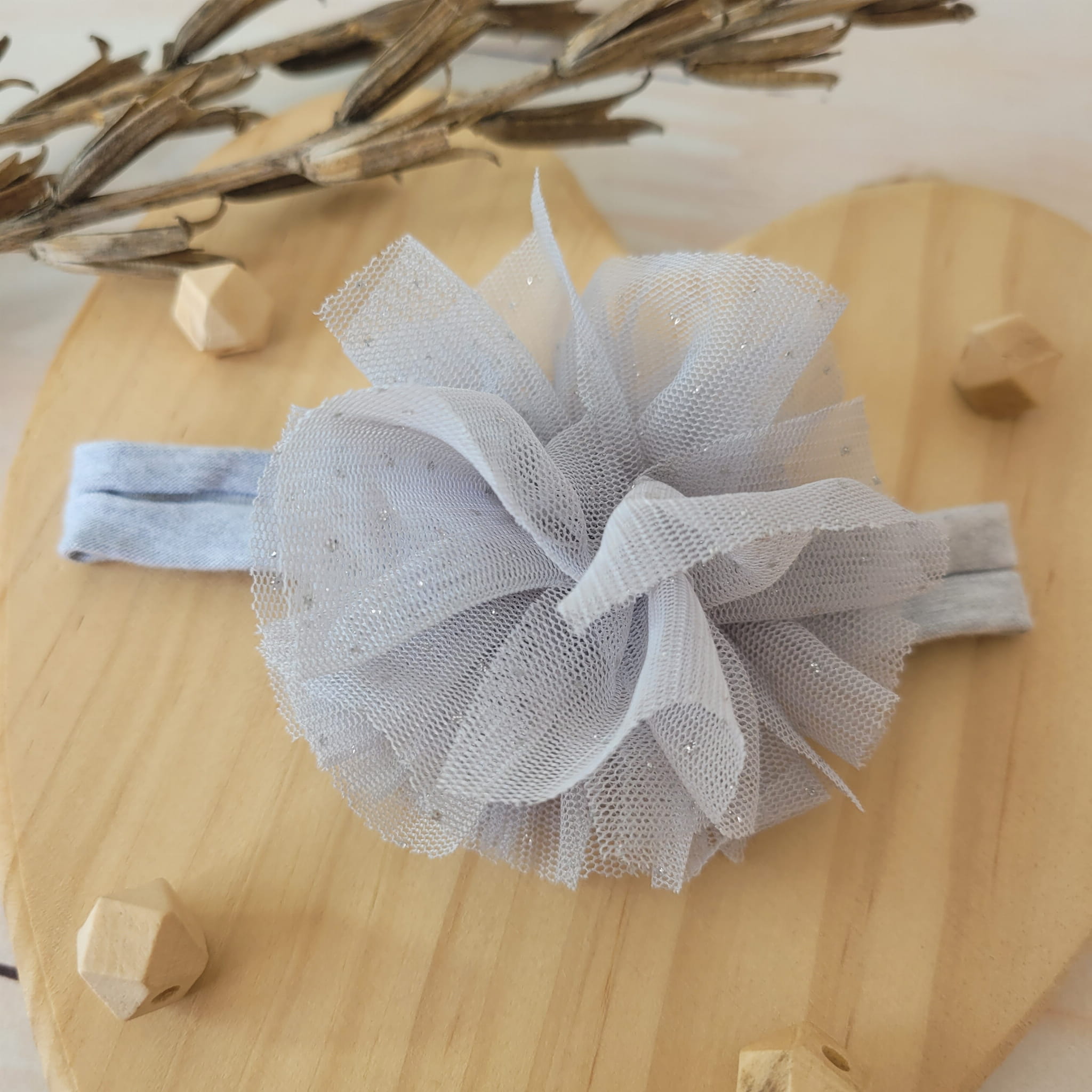 opaska tiulowa bezuciskowa z pomponem z tiulu szara